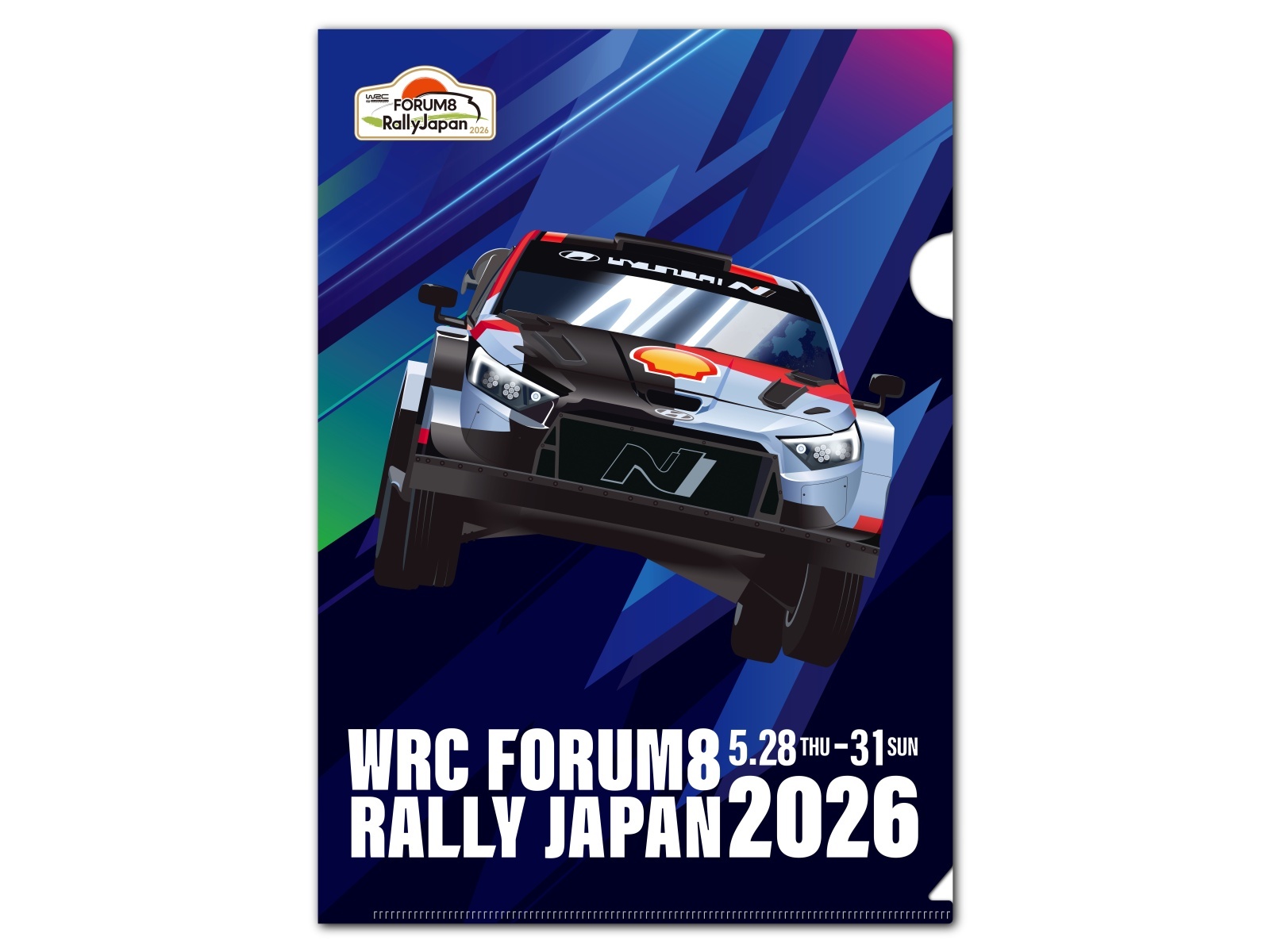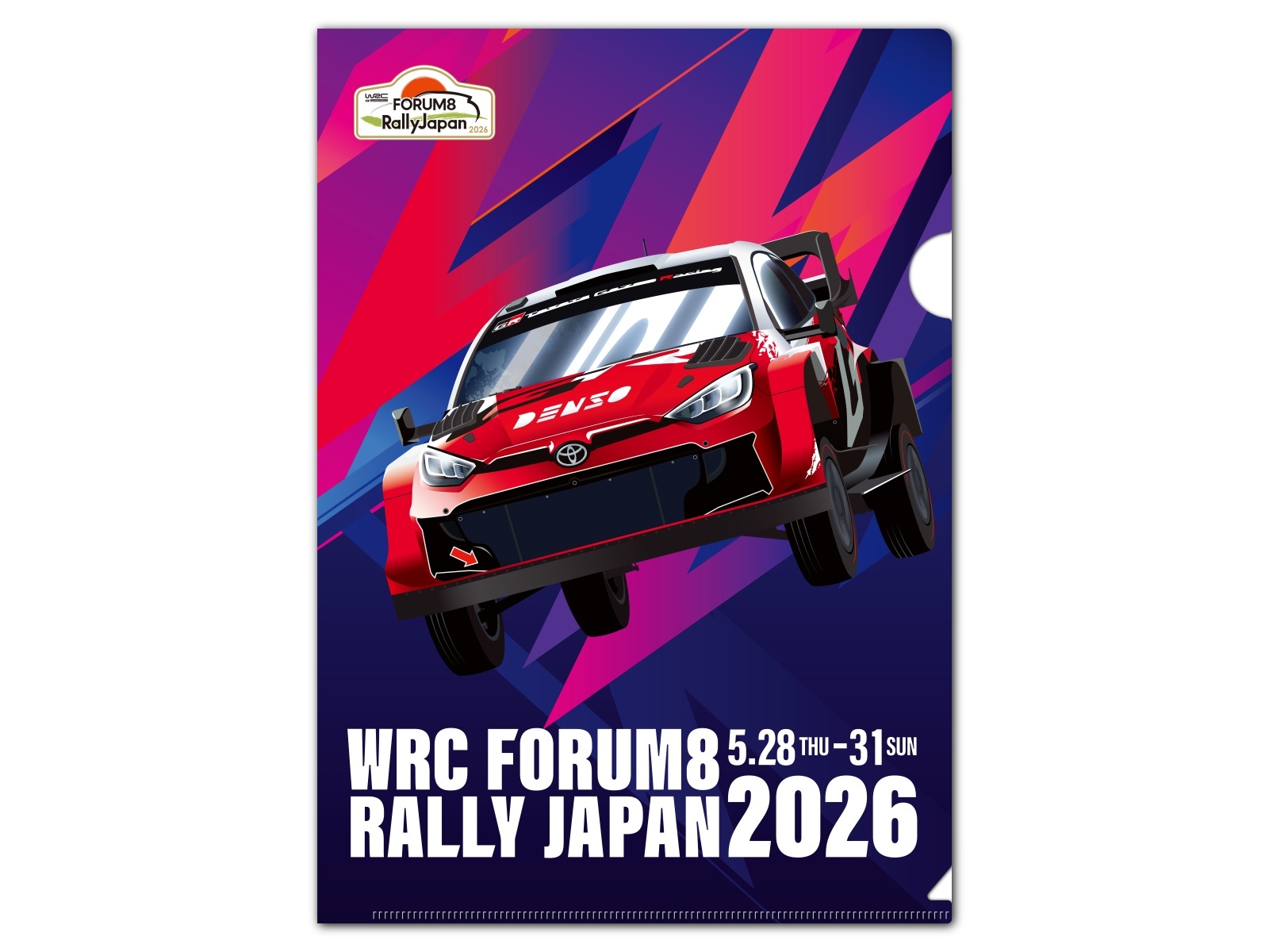 キービジュアルから飛び出したラリーカーデザインのクリアファイル。トヨタ、ヒョンデ、フォードの3種セット。
